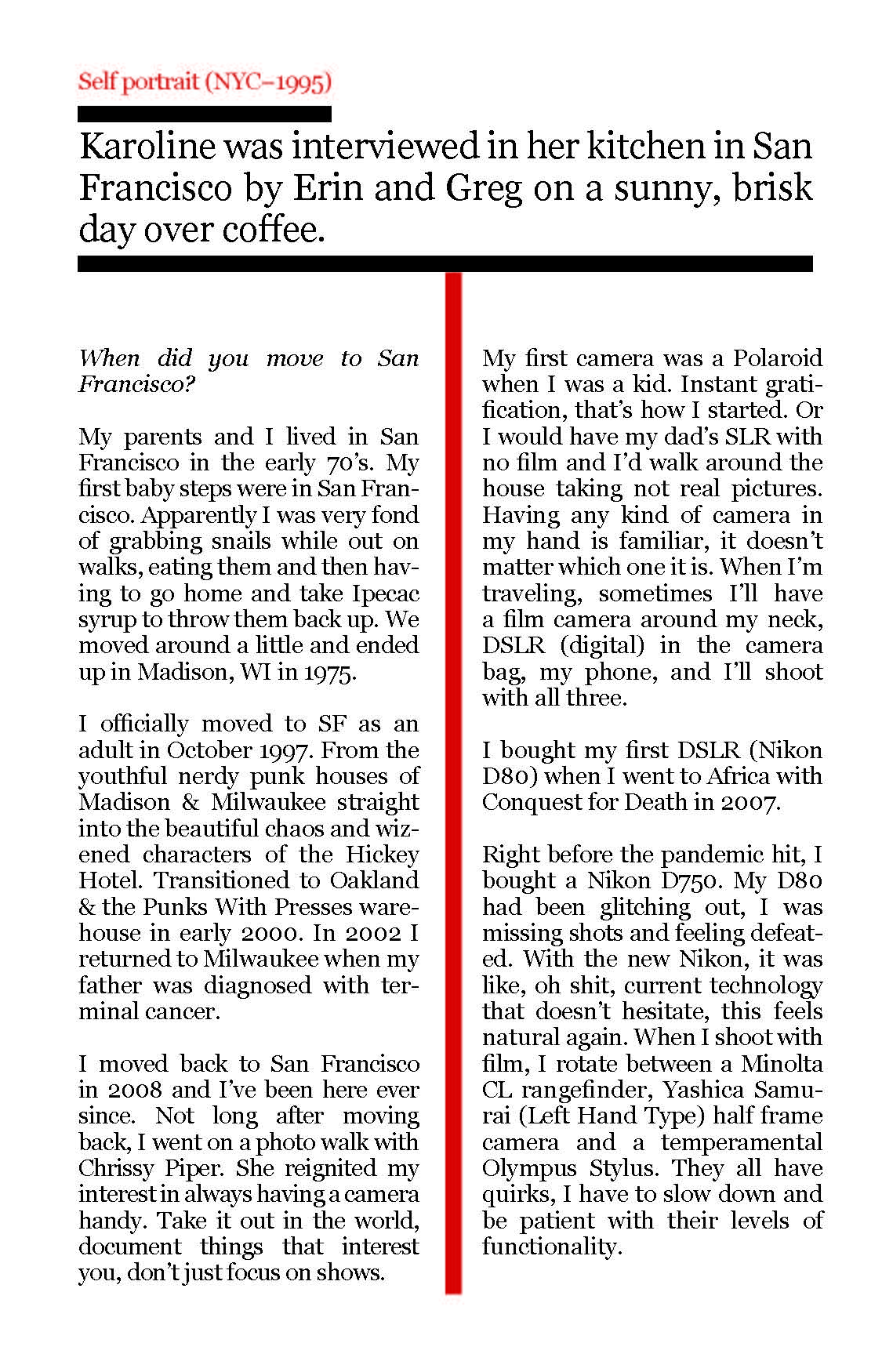 The zine spans nearly 30 years of images and includes an interview with Karoline about her life and photography, conducted by Erin Yanke and Greg Harvester. Further editing and layout by Jessica Mills and Alec Dunn. 60 pages. Pro-printed. 5.5" x 8" Digest-sized.